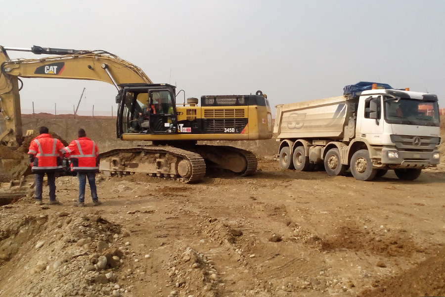 Realizzazione di Movimenti di materie, con scavi di sbancamento, formazione di rilevati, stabilizzazione a cemento, trasporto di terre e rocce da scavo, profilatura e rivestimento scarpate con terreno vegetale. Lavori realizzati sul doppio turno lavorativo.